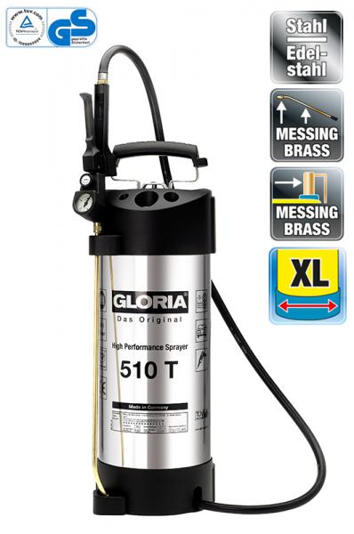 У высокопроизводительного распылителя 510 T напорный резервуар из нержавеющей высококачественной стали, который может вместить до 10 л распыляемого средства и подходит для рабочего давления макс. 6 бар. С печатью TÜV и GS подходит для внесения биологических средств защиты растений.